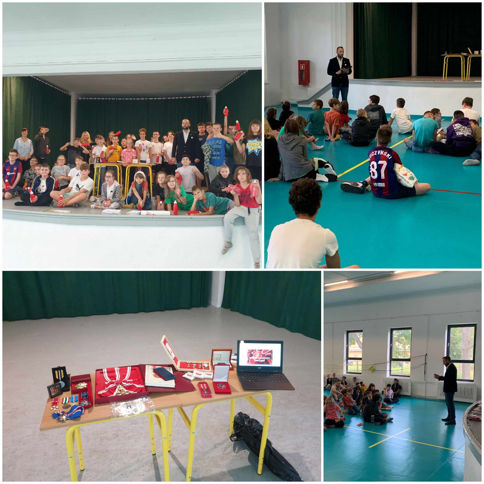 Lekcje przeprowadzał komandor zachodniej św. Floriana z RCKiK we Wrocławiu, były przedstawione ordery nasze oraz medale. Nie zabrakło też promocji HDK oraz dlaczego warto pomagać...