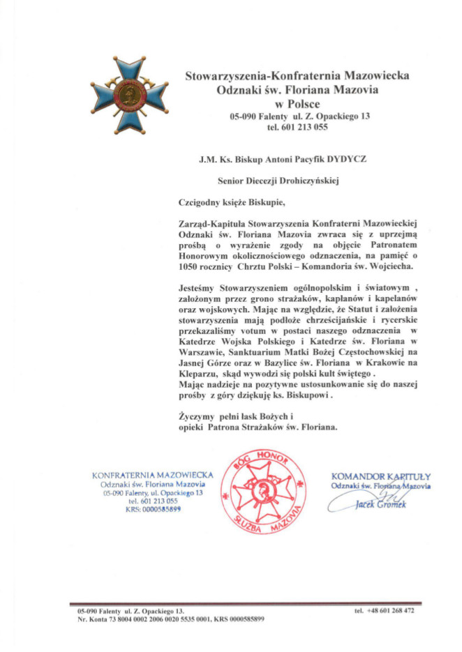 Kapituła Konfraterni Mazowieckiej Odznaki św. Floriana Mazovia, w porozumieniu