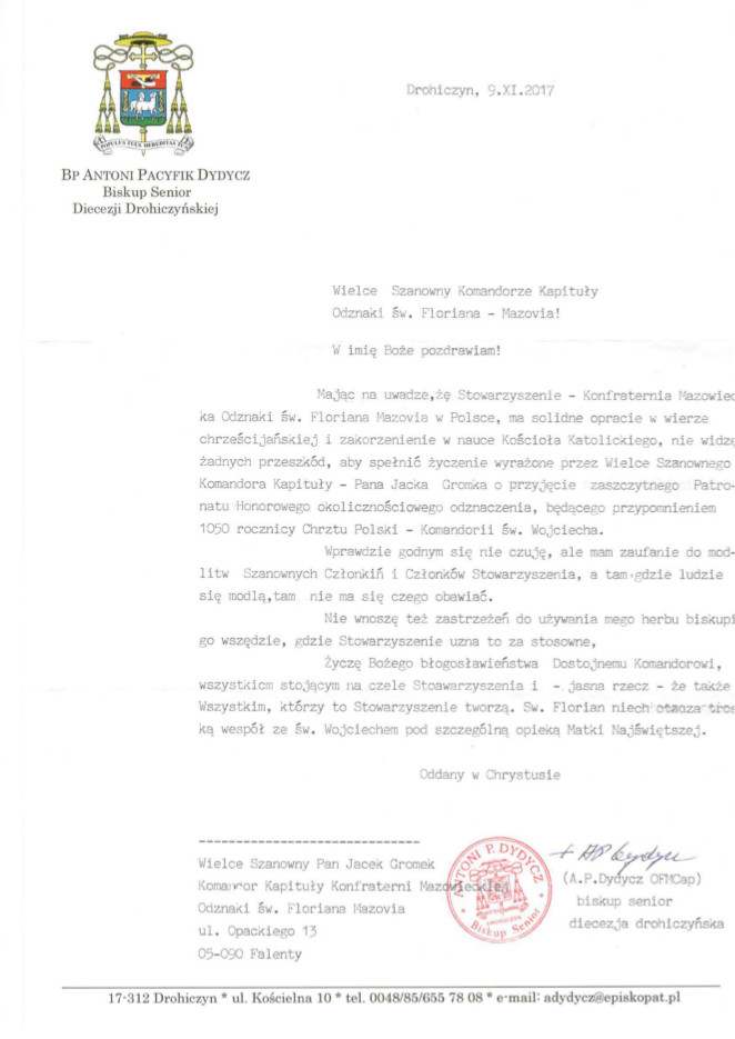 Honorowy patronat nad nowo ustanowioną komandorią przyjął ks. Biskup Antoni Pacyfik Dydycz.