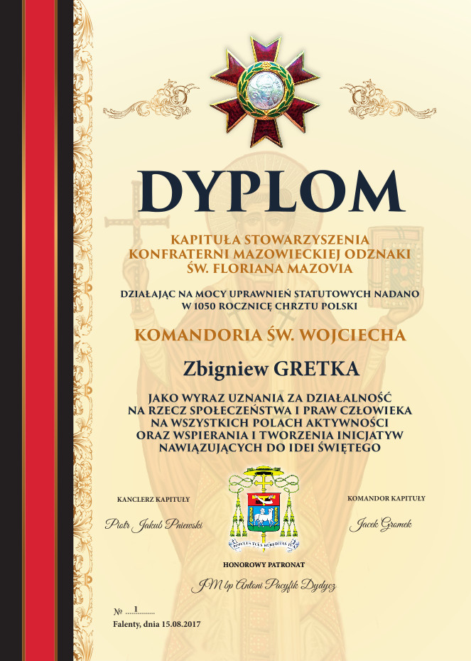 z okazji 1050 rocznicy Chrztu Polski, Zarząd Stowarzyszenia – Konfraternia Mazowiecka Odznaki św. Floriana Mazovia w Polsce, postanowił ustanowić Komandorię Świętego Wojciecha nadawaną jako wyraz uznania za działalność na rzecz społeczeństwa i praw człowieka, na wszystkich polach aktywności oraz wspierania i tworzenia inicjatyw nawiązujących do idei świętego.