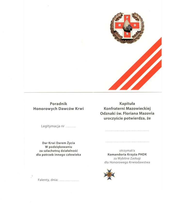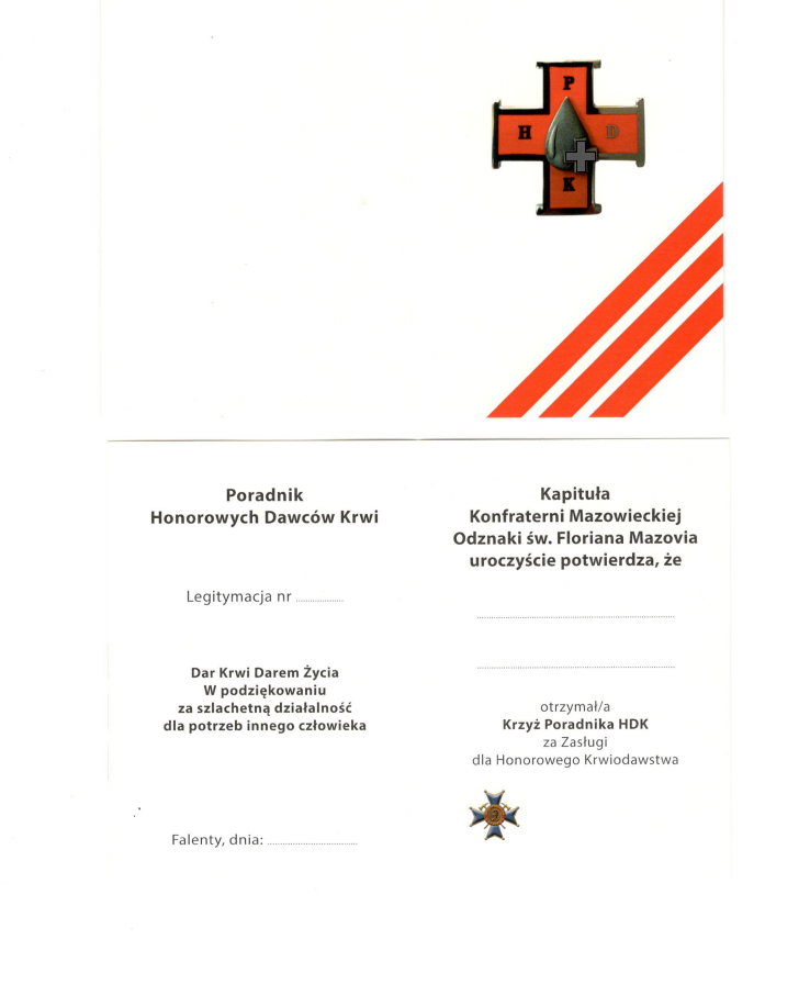 Konfraternia Mazowiecka Odznaki św. Floriana Mazovia, w nawiązaniu do Krzyża PHDK za Zasługi, wprowadza od sierpnia 2023r Komandorię Krzyża PHDK za Wybitne Zasługi dla Honorowego Krwiodawstwa.