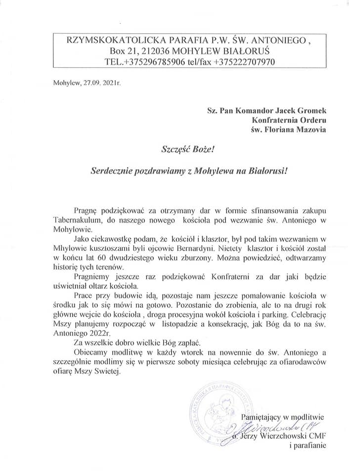 Starannością Komandora Kapituły Orderu św. Floriana Mazovia dnia 13.06.2025r w dniu św. Antoniego, uroczystą procesją zostały wprowadzone do kościoła św. Szczepana w Raszynie jako Dar Konfraterni Relikwie I stopnia wraz z figurą św. Antoniego z Padwy. Jako votum w realizacji statutowych zadań Stowarzyszenia w dziedzinie upowszechniania służby Polsce wyrazem uznania działalności na rzecz społeczeństwa oraz wspierania i tworzenia inicjatyw nawiązujących do idei Świętego.
