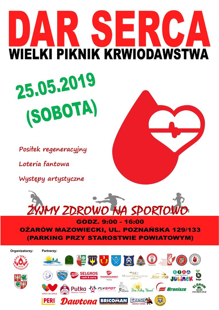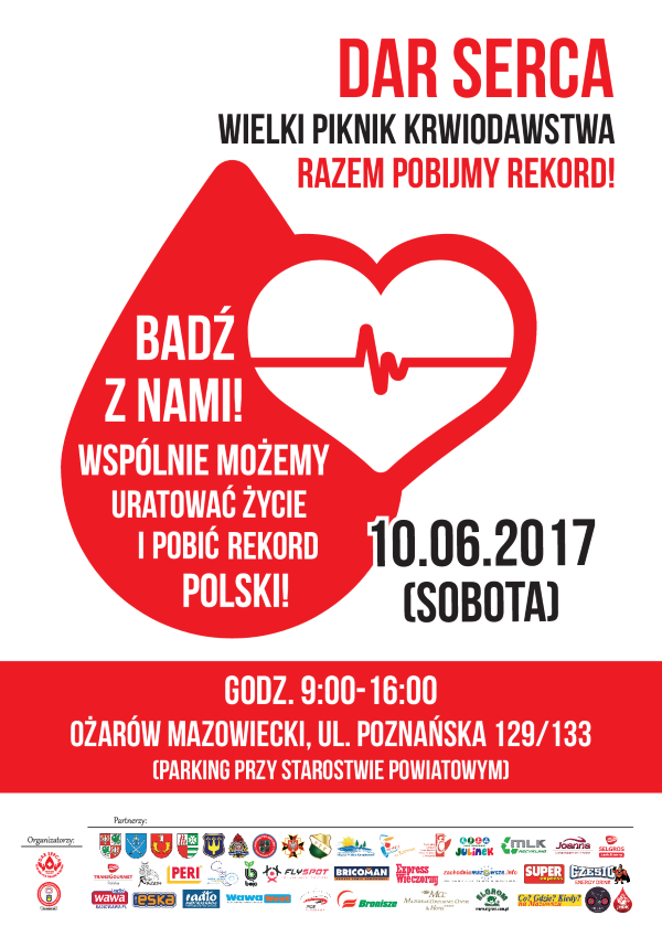 terenie Starostwa Warszawa Zachód w Ożarowie Mazowieckim, w dniu 25.06.2016r. (sobota). Klub organizuje akcję ogólnopolską pod hasłem "DarSerca", która ma za zadanie spowodować, aby w jednym dniu, w godzinach od 9:00 do 16:00, krew oddała jak największa ilość dawców.