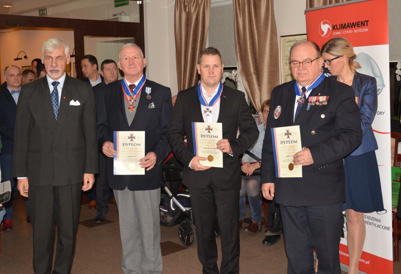 Kawalerowie Krzyża Św. Floriana I kl., od prawej: Edward Golis, Dariusz Kloskowski i Zenon Blok oraz Prezes Klubu Paweł Szczepanik