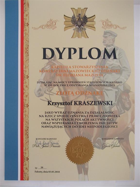Odznaką św. Floriana Mazovia I klasy , aktu dekoracji dokonali Komandor Kapituły Jacek Gromek i Kanclerz Piotr Jakub Pniewski.